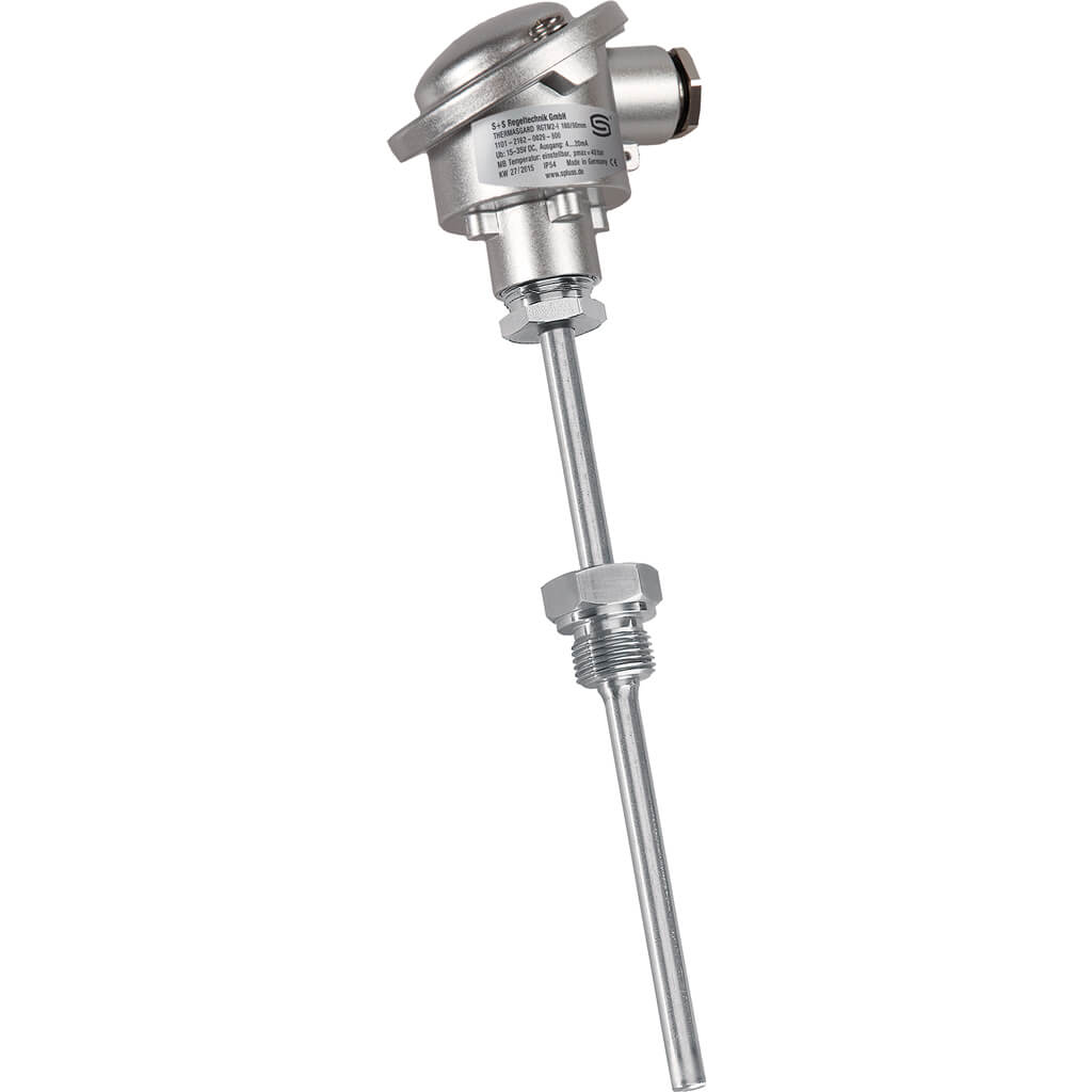 Kort beskrivelse: 150mm dykrør temperaturføler 0-600°C. Udgangsignal 4-20mA, 1/2" fastmonteret V4A dykrør
