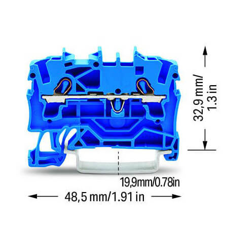 Kort beskrivelse: Blå rækkeklemme med fjeder tilslutning. Max. 2,5 kvadrat leder. Til montering på DIN skinne. Bredde 5mm.