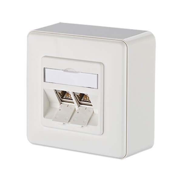 Kort beskrivelse: Komplet hvid netværksdåse med 2 udtag til montering på vægen. Inkl. 2 styk Cat. 6a konnektor som monteres uden brug af specialværktøj. -Restsalg, spar Stort-