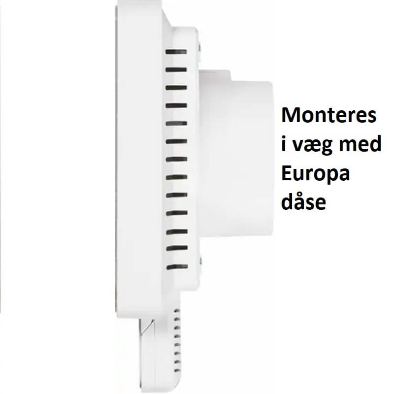 | Montering: | i Europa dåse ø55mm. Tilslutningsklemmer bagud, passer ind i vægmonteret Europa dåse. |