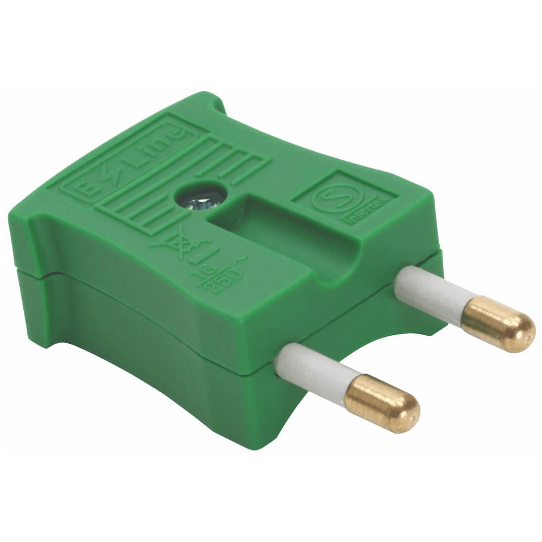 Kort beskrivelse: Forstærket - slagfast grøn 230V stikprop uden jord. Kabel udgang lige i forhold til stikket.